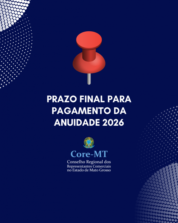 O Conselho Regional dos Representantes Comerciais no Estado de Mato Grosso (Core-MT) alerta todos os profissionais registrados sobre o prazo final para o pagamento da Anuidade 2026. Para garantir a regularidade profissional e manter o registro ativo junto ao Conselho, o pagamento deve ser efetuado até o dia 30 de abril de 2026.